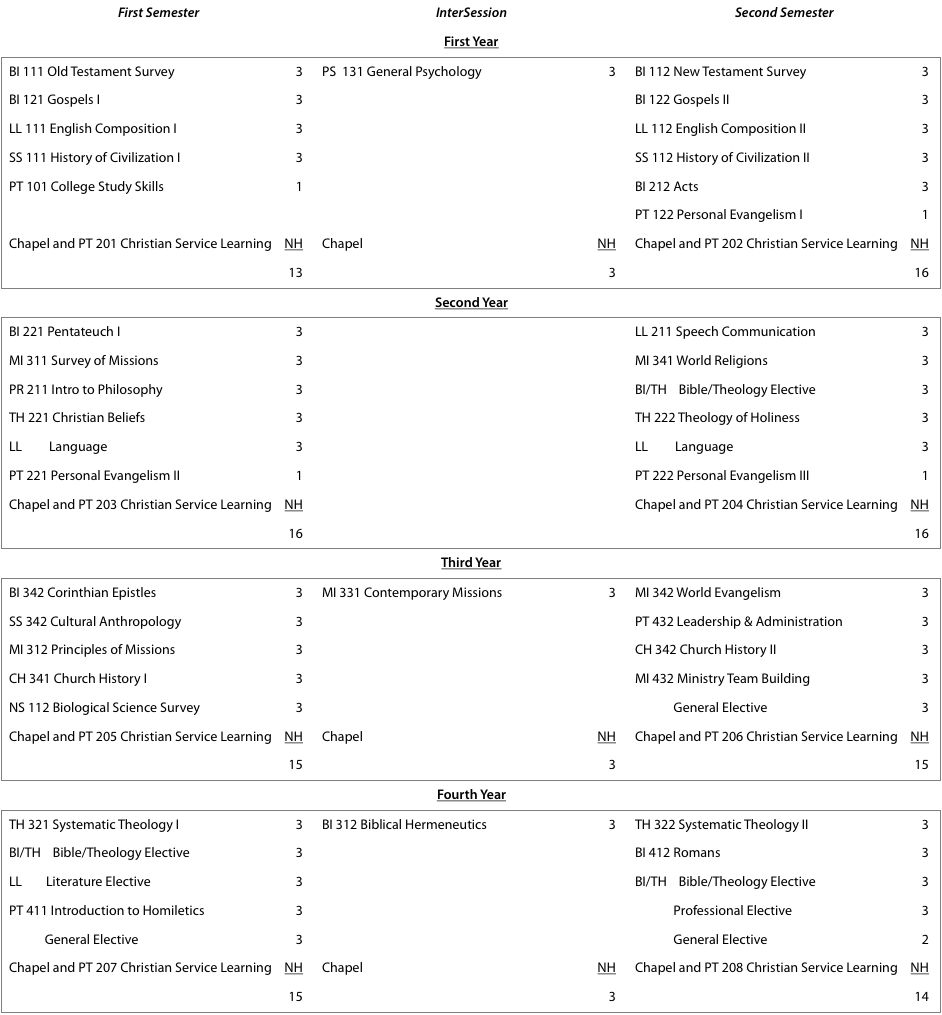 Personal Evangelism, 3 hours; Survey of Missions, 3 hours; Principles of Missions, 3 hours; Contemporary Missions, 3 hours; World Religions, 3 hours; World Evangelism, 3 hours; Language, 6 hours; Church History, 6 hours; Introduction to Homiletics, 3 hours; Leadership & Administration, 3 hours; Ministry Team Building, 3 hours; Missionary Internship, 6 hours; Professional Electives, 4 hours (Ladies will be required to take Women in Cross-Cultural Ministry, 1 hour).