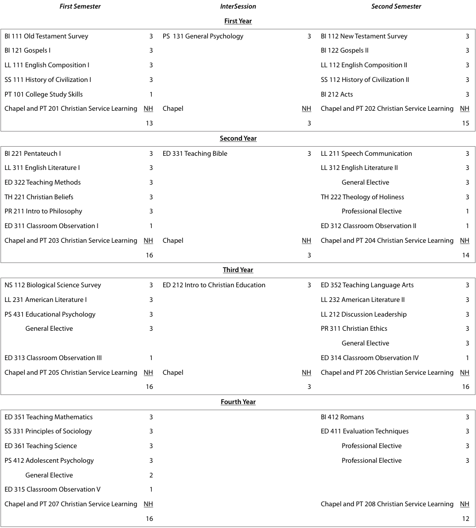 Introduction to Christian Education, 3 hours; Christian Ethics, 3 hours; Teaching Methods, 3 hours; The Teaching of Bible, 3 hours; The Teaching of Mathematics, 3 hours; The Teaching of Science, 3 hours; Teaching Language Arts, 3 hours; Sociology, 3 hours; Evaluation Techniques & Lesson Planning, 3 hours; Adolescent Psychology, 3 hours; Educational Psychology, 3 hours; Classroom Observation, 5 hours; Student Teaching, 12 hours; Professional Electives, 7 hours.
